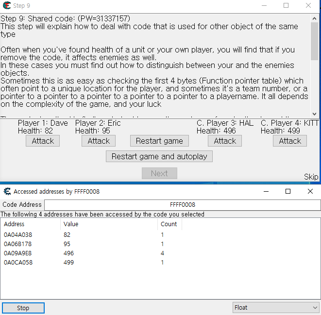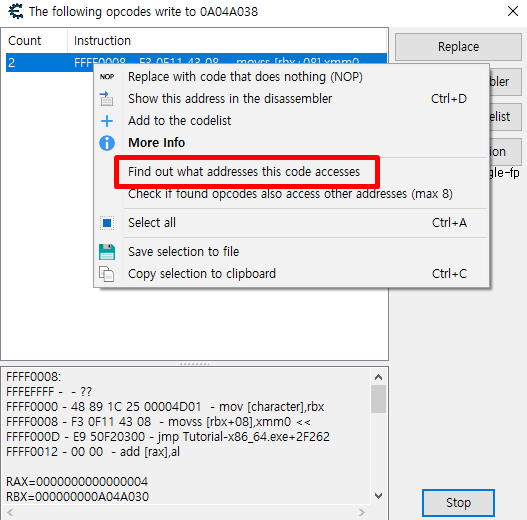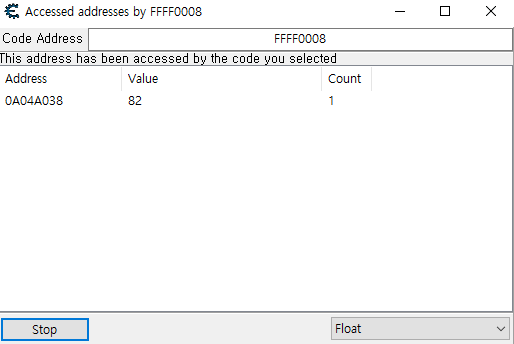 " Code Address FFFF0008 " 는 체력 값을 변경하는 명령어 주소 입니다FFFF0008 - F3 0F11 43 08 - movss [rbx+08],xmm0