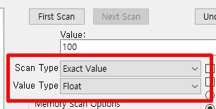 일단 Value를 100을 입력하고 Value Type을 Float로 First Scan 해줍니다.
