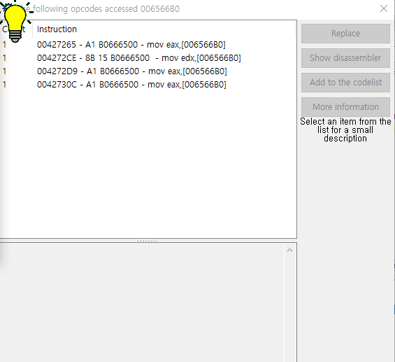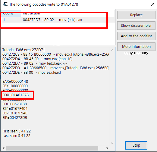 instruction 목록에 004272D7 - 89 02 - mov [edx],eax << 있습니다 .