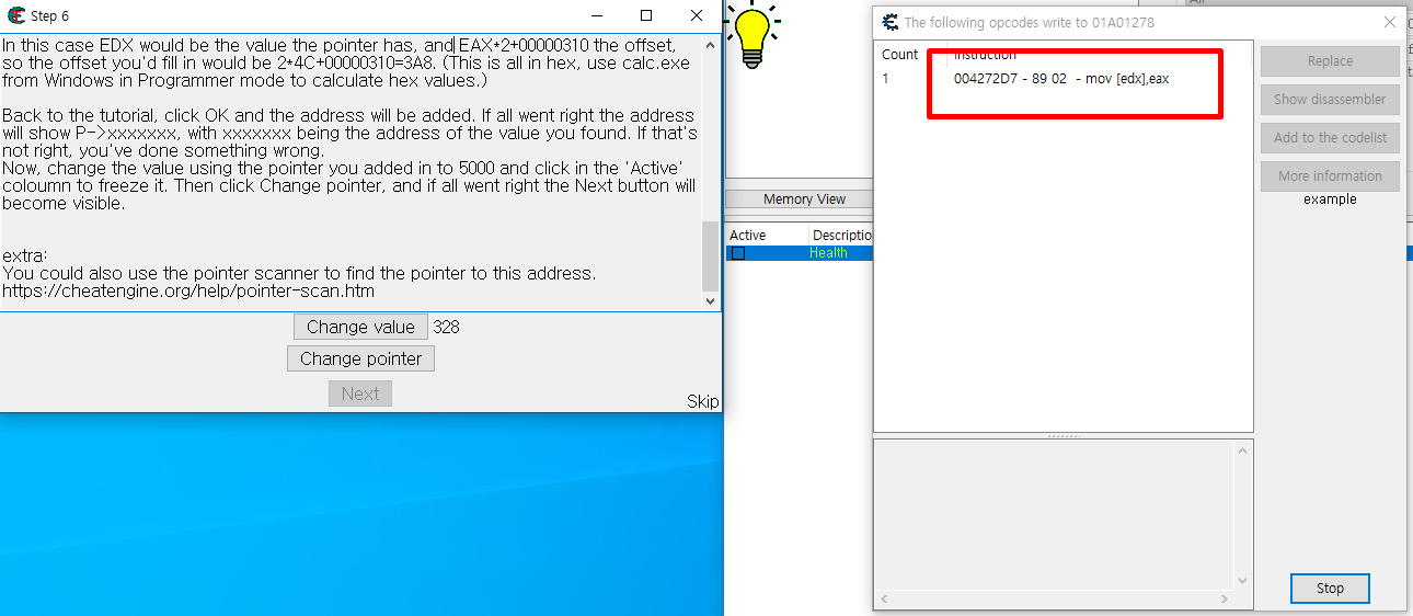 치트엔진 튜토리얼 5와 같이 주소를 찾고 디버깅을 합니다 .